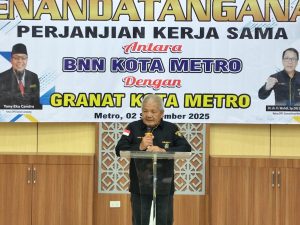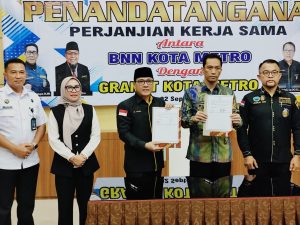Kota Metro — Penandatanganan perjanjian kerja sama antara Bandan Narkotika Nasional (BNN) Kota Metro dan Gerakan Nasional Anti Narkotika (GRANAT) Kota Metro. Acara berlangsung di Ballroom Hotel Grand Sekuntum setempat, Selasa (02/09/2025).